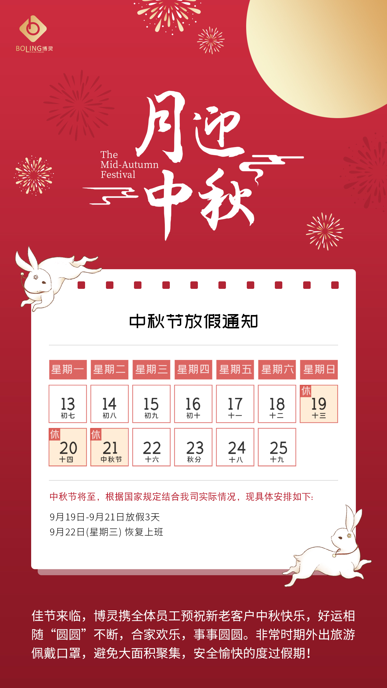 值此佳節來臨之際,博靈攜全體員工預祝新老客戶中秋快樂,好運相隨“圓圓”不斷,合家歡樂,事事圓圓。非常時期外出旅游佩戴口罩,避免大面積聚集,勤洗手,多通風,安全愉快的度過假期!